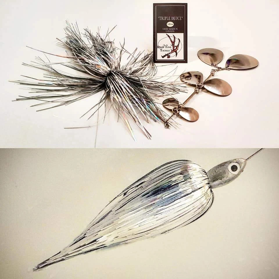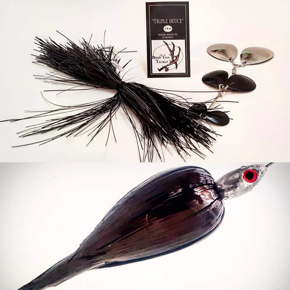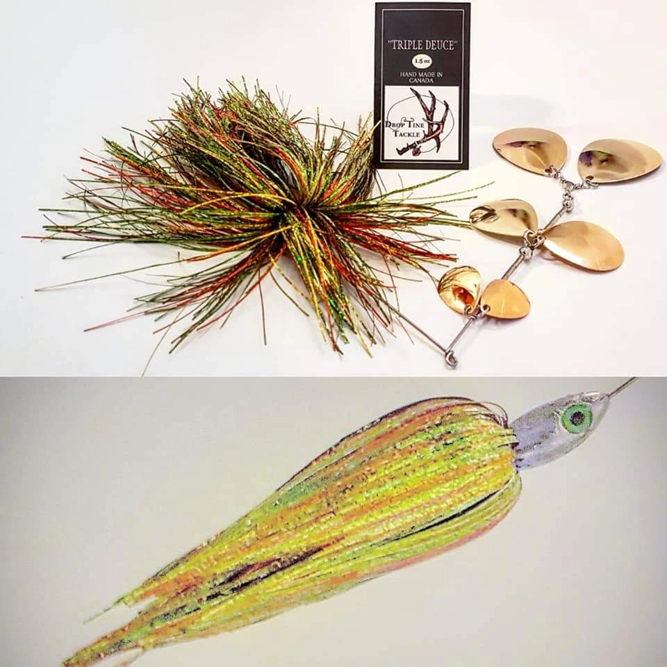 The Triple Deuce is a one of kind spinnerbait like no other. It has the same features as a double bladed bucktail but times the blades by three and turn the bucktail into a spinnerbait. Making lots of vibration, while moving lots of water the “Triple Deuce” bring muskie and pike in from a long ways away or pull them out of the dense weed cover.