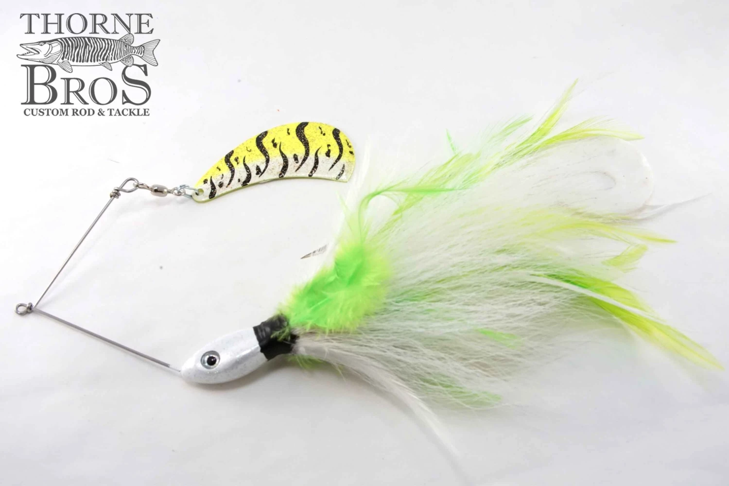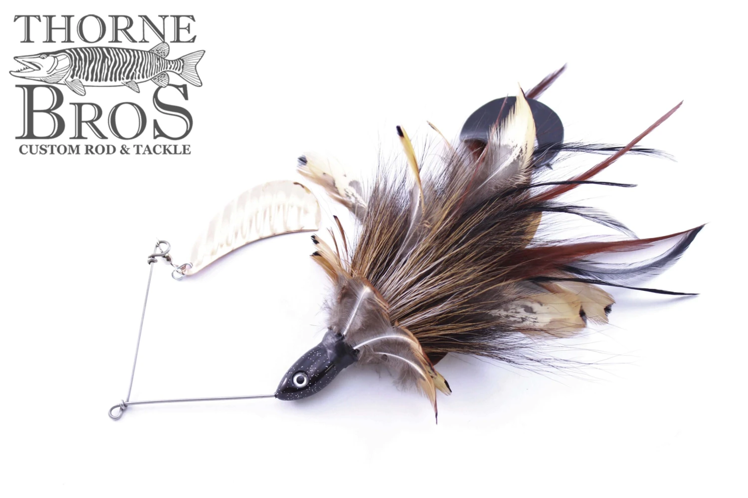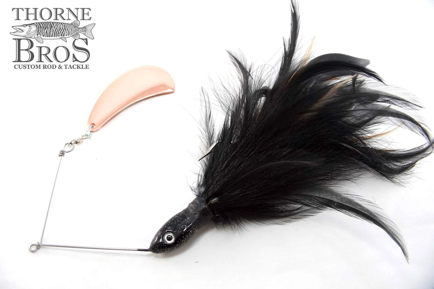 Now here’s a totally different package from Musky Safari. “The Serial Killer” features deer hair and hackle along with a giant Mogambo tail. Add the hatchet blade and you’ve got a spinnerbait that’s simply deadly. At an overall length of 11” this bait throws a big profile that muskies just can’t resist.